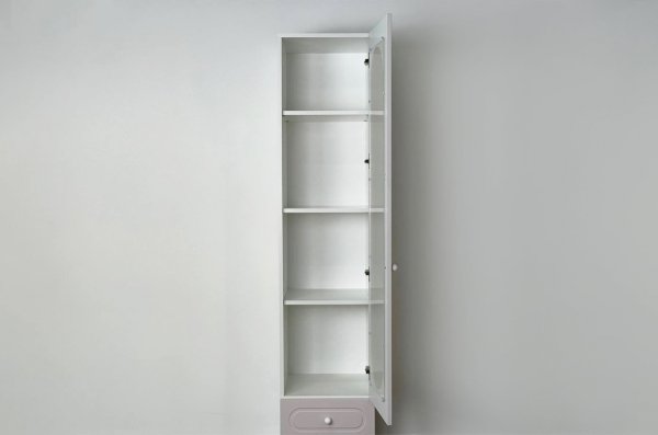 Модель оснащена одной распашной дверцей с вставкой из прозрачного рифлёного стекла, а также двумя вместительными выкатными ящиками в нижней части для хранения одежды, текстиля или аксессуаров. Внутреннее наполнение можно выбрать в зависимости от задач: шкаф комплектуется полками или штангой для плечиков, что позволяет адаптировать его под разные потребности.